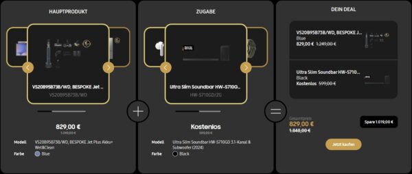 Bei Samsung erhaltet ihr derzeit im Rahmen der alljährlichen Bundle-Aktion zum Black Friday den Samsung Bespoke Jet Plus Staubsauger für 787,55€ + GRATIS Samsung HW-S710GD Soundbar (Vergleichspreis: ~1.094€) Ersparnis ~306€