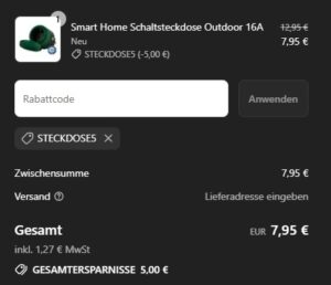 Perfekt wenn ihr euren Außenbereich auch noch etwas smarter machen möchtet, bei Smarthaven bekommt ihr die Smart Home Schaltsteckdose Outdoor 16A (kompatibel mit Alexa, Google Home, tuya) für 7,95€ (Vergleichspreis ~13€) Ersparnis ~5€