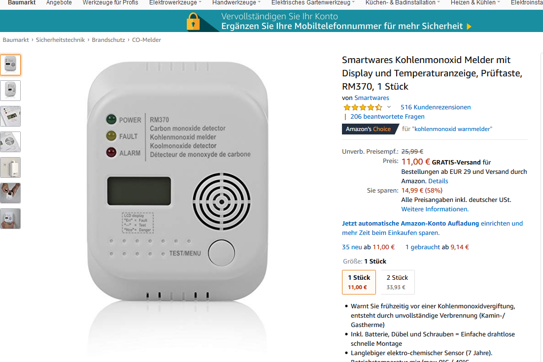 Bei MediaMarkt bekommt ihr den SMARTWARES SW RM370 Kohlenmonoxidmelder für 11€ (Vergleichspreis ~16€) Ersparnis ~5€