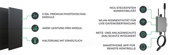 Das Angebot beinhaltet 2x400W Solar-Module und ein 600W Wechselrichter + einiges an Zubehör.