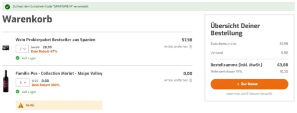Legt dazu einfach das Probierpaket in den Warenkorb, ändert die Anzahl auf 2x und verwendet anschließend den Gutschein-Code GRATISWEIN.