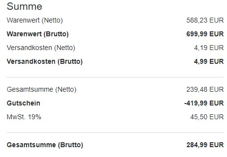 Die Versandkosten liegen zwischen 4,99€ und 49,99€ je nach Artikel.