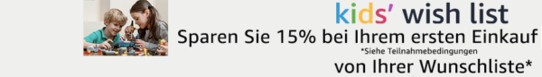 Dank der Amazon Kids‘ Wishlist könnt ihr 15% auf den ersten Einkauf (Spielwaren, aber auch Tablets/Konsolen) von der Wunschliste sparen.