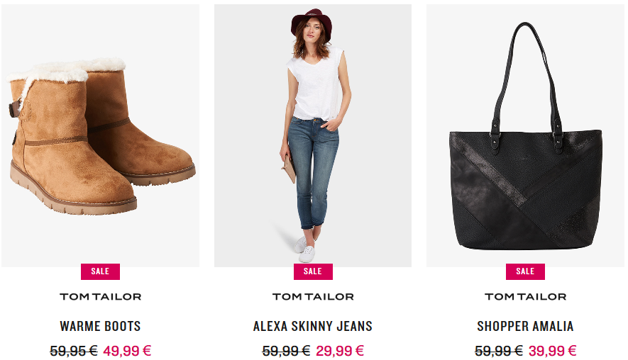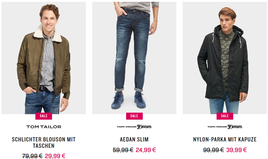 Das ist nicht übel! Ihr bekommt bei dieser Aktion Jeans bereits ab 17,99€ und Jacken ab 29,99€. Wer sich hier noch mit Winterklamotten eindecken muss, sollte wenigstens einen Blick drauf werfen. Es gibt nur selten so hohe Rabatte bei Tom Tailor, außer es gibt mal Gutscheincodes.