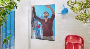 - Das Insektenschutzgewebe lässt sich auf die gewünschte Größe zuschneiden – Selbstklebendes tesa Klett-Klebeband für einfache Montage ohne Bohren anbei