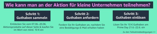 Bei Amazon ist nun noch eine weitere Aktion gestartet, bei der ihr als Prime-Mitglied 10€ geschenkt für Amazon Prime Day (bei Einkauf ab 10€ bei kleinen & mittleren Unternehmen).
