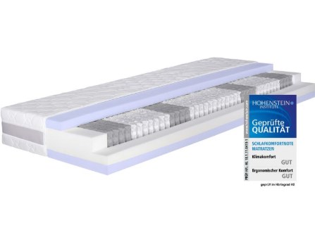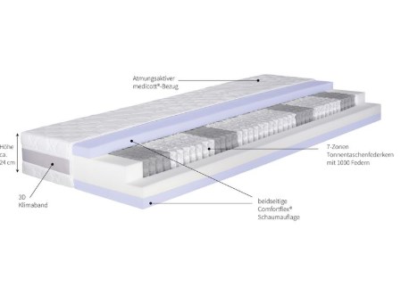 Die Öko-Tex Standard 100 zertifizierte ‚‘7-Zonen-Taschenfederkernmatratze medicott 1000“ hat einen Taschenfederkern mit 1000 Federn (Basis 100/200 cm). Die 7 Liegezonen in Verbindung mit 1000 Federn, die einzeln in luftige Gewebetaschen eingenäht sind, sorgen für eine einzigartige Stützung der Wirbelsäule. Die Schultern und das Becken werden exzellent entlastet. Sehr gute Ventilation und schneller Feuchtigkeitstransport. Sie ist ausgestattet mit 4 Wendeschlaufen für eine einfache Handhabung. Durch das vorhandene 3D-Klimaband ist eine permanente Luftzirkulation vorhanden. Der atmungsaktive und feuchtigkeitsregulierende medicott-Bezug (73 % Polyester, 27 % Baumwolle) ist abnehmbar und bis 60 °C waschbar. Medicott kennzeichnet Textilerzeugnisse aus Baumwolle, die eine hohe textile Qualität aufweisen, umweltverträglich behandelt wurden, einen hohen Reinheitsgrad aufweisen und bei Beachtung der Pflegeanleitungen für Allergiker mit Sensibilität gegen Schimmelpilz und Staubmilben zu empfehlen sind. Das medicott-Verfahren bewirkt eine nahezu vollständige Entfernung der Faserbegleitsubstanzen in zwei Behandlungsschritten. Es entspricht einer Intensivreinigung, bei der ausschließlich unbedenkliche, lebensmittelzugelassene Wirkstoffe zum Einsatz kommen. Die Matratze wurde im Härtegrad 2 und Härtegrad 3 vom Hohenstein Institut auf Klimakomfort und dem ergonomischen Komfort getestet und mit ,,gut‘‘ bewertet.Die 7 Zonen Taschenfederkernmatratze medicott 1000“ hat eine Gesamthöhe vonca. 24 cm. Hinweis: Bitte nur Lattenroste mit engen Leistenabständen (max. 3-4 cm) verwenden.