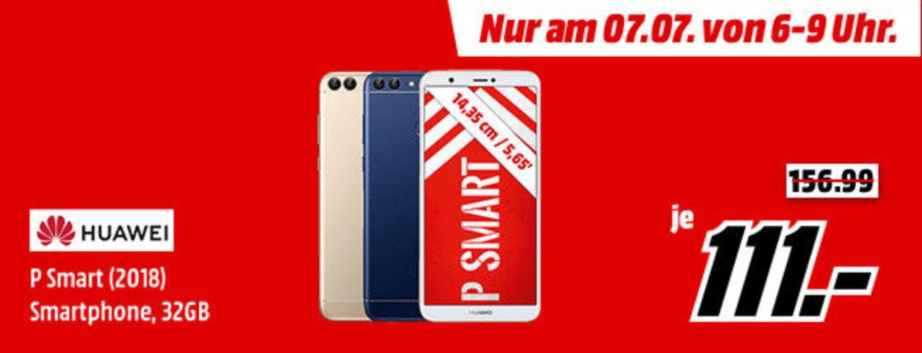 Am 7. von 6-9 Uhr bekommt ihr das HUAWEI P smart 32 GB Blau Dual SIM 2018 für 111€.