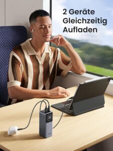 - 100W Hochgeschwindigkeits-Ladeleistung:Versorgt deine iPad, Smartphone und mehr mit der leistungsstarken Powerbank. Mit einer maximalen Leistung von 100W kannst du iPad Pro 11″(M4) in nur 30Minuten auf 40% Akku aufladen. Dieses Flugzeug geeignete Powerbank kann auch an Bord mitgenommen werden.