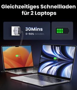 - Mit dem hochmodernen PD3.1 Protokoll ermöglicht UGREEN Nexode 140W USB C Ladegerät einen maximalen Fortschritt in der aktuellen Ladestufe. Unser 140W USB C Power Adapter kann mit der schnellstmöglichen Ladegeschwindigkeit Ihr MacBook Pro 16″ 2021 von 0 % bis 50 % in nur 26 Min. aufladen. Und bei dem neuen Nexode 140W ist es auch möglich, zwei Laptops in einer Ausgangsleistung von 65W an C1&C2 Port gleichzeitig aufzuladen.