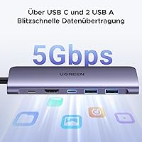 - 7 in 1 USB C Hub – Alles in Einem: UGREEN USB C Multiport Hub verwandelt einen USB C Port in 7, einschließlich eines 4K@30Hz HDMI Anschluss, 2*USB A 3.0, 1*USB C 3.0, SD/TF Kartenslots und eines 100W USB C PD Anschluss.