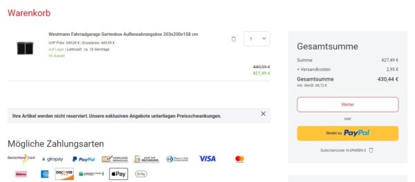 Jetzt mal ein Deal für die Fahrradfahrer unter euch, die noch eine passende Unterstellmöglichkeit suchen, im Onlineshop von Netto bekommt ihr die Westmann Fahrradgarage, Gartenbox, Aufbewahrungsbox 203x200x158 cm für 430,44€ (Vergleichspreis ~519€) Ersparnis ~89€