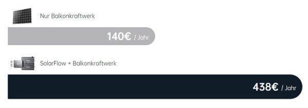 Durch den Speicher verlagert ihr zudem euren Verbrauch etwas und spart damit Geld ein. Der Anbieter rechnet vor, dass ein Balkonkraftwerk durchschnittlich etwa 3 kWh Strom pro Tag erzeugt und der durchschnittliche Haushalt in Deutschland jährlich etwa 3.500 kWh verbraucht. Somit können 438 € pro Jahr (0,40 € pro kWh) eingespart werden können – dies entspricht etwa ein Drittel (32 %) der jährlichen Stromrechnung. (Quelle: https://ertragsdatenbank.de; https://www.bundesregierung.de)
