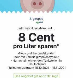 8cent pro Liter an allen Teilnehmenden Tankstellen bei Zahlung über die App und Giropay. Ich habe es auch schon getestet – funktioniert.