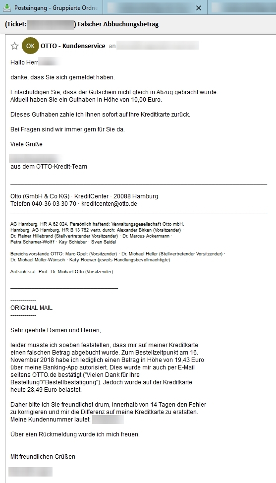 Mails erhalte ich von Otto immer noch nicht. Aber in der Rechnung auf der Website steht bei mir auch 28,49. Aber zusätzlich steht da "Betrag bis zum 08.01.2019 13,49". Also gehe ich davon aus, dass ich nur 13,49 zahlen muss. Das würde auch zu dem ominösen Gothaben von 15 Euro passen, das irgendwie in meinem Kundenkonto ist. 13,49 + 15,00 wären dann ja 28,49 Euro. Erwähnt wird ein Guthaben oder Gutschein in der Rechnung allerdings nicht. Alles etwas seltsam bei Otto.