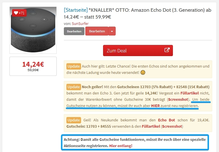 Mir ist / war nicht bekannt, dass es den Dot 3 schon einmal für 19,99 Euro gegeben hat. Wenn ich also im Dealtext von 19,99 Euro lese, dann muss ich als "stiller Teilnehmer" dieses Blogs davon ausgehen, dass der Dealtext aktuell ist.