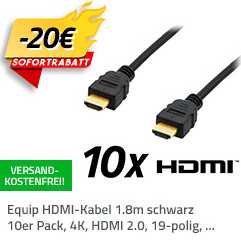 Bei Office-Partner bekommt man mit dem Gutscheincode: HSSEHK 10x Equip HDMI-Kabel 1.8m schwarz für 14,90 statt 34,90 Euro inkl.Versand