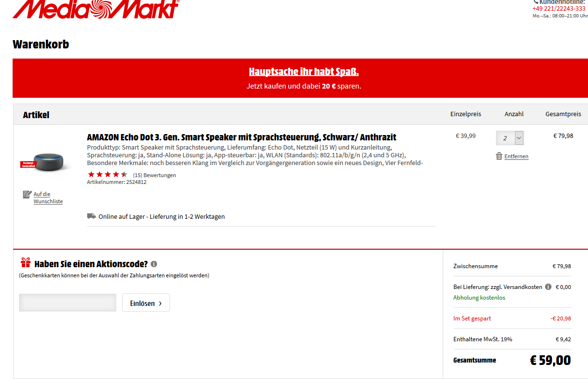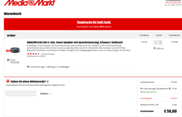 Bei Medimarkt bekommt ihr Heute und bis Morgen 2x den AMAZON Echo Dot 3 für zusammen für 59,00 Euro inkl.Versand PVG 70,00 Euro.