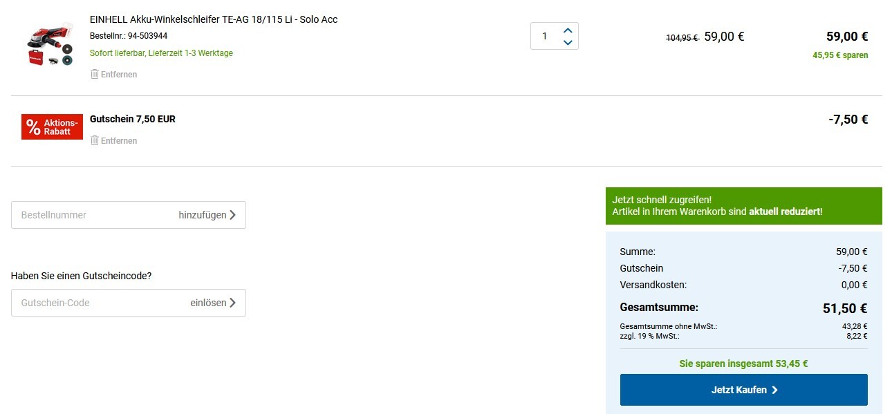 z.B. den EINHELL Akku-Winkelschleifer TE-AG 18/115 Li – Solo für 59€ inklusive Versand ohne obige Rabatte!