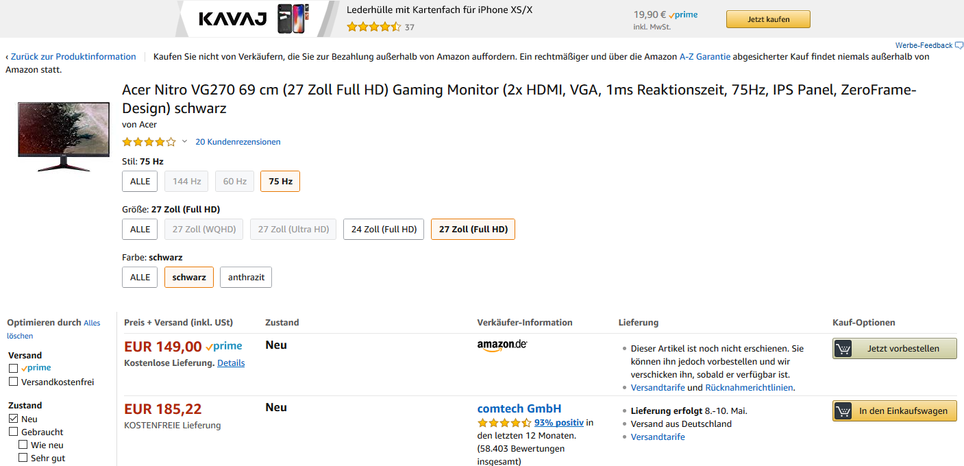 Acer Nitro VG270 69 cm (27 Zoll Full HD) Gaming Monitor (2x HDMI, VGA, 1ms Reaktionszeit, 75Hz, IPS Panel, ZeroFrame-Design) schwarz für 149,00 statt PVG 189,00 Euro inkl.Versand bei Amazon.