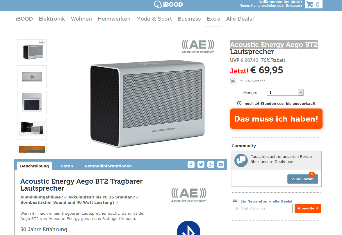 Im Vergleich zahlt ihr für das gute Stück in anderen Onlineshops mindestens 163€ (bei Amazon UK £189.97 = ~207,84€ https://www.amazon.co.uk/Acoustic-Energy-BT2-Bluetooth-Speaker-silver/dp/B06WVDMTNZ/ ), die Ersparnis beträgt also knapp 77€!