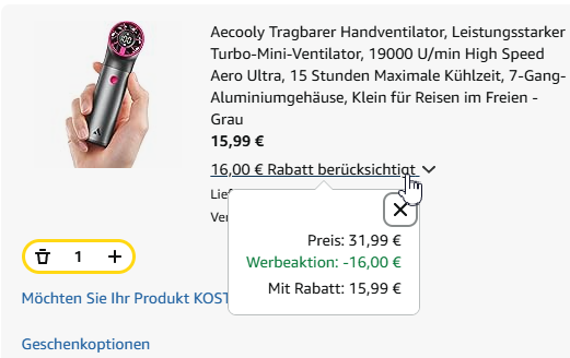 Und somit bekommt ihr dort den Aecooly Tragbarer Handventilator mit 15 Stunden Kühlzeit für effektiv nur 15,99€