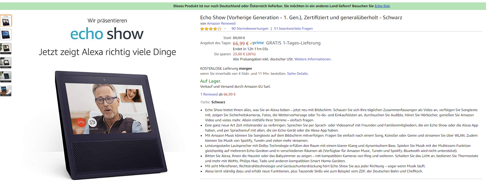 Heute git es den Amazon Echo Show 1. Generation zum bisherigen Bestpreis für 99,99€.