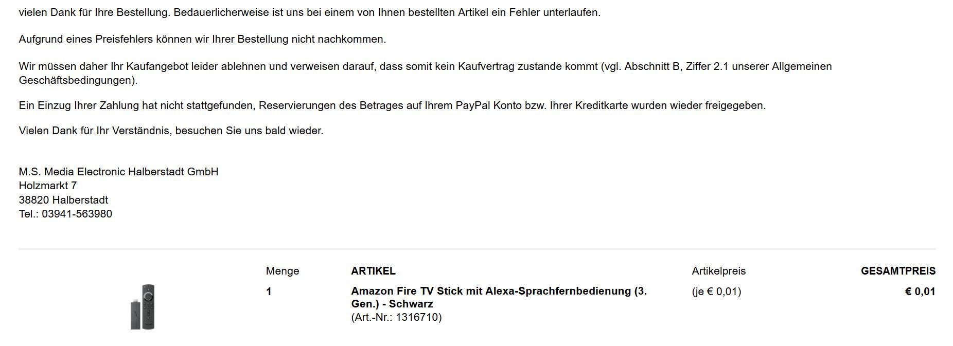 splash 16.01.2021, 18:35 #d.h. aber nicht, dass der Artikel auch vom Händler tatsächlich geliefert wird… er kann rechtlich gesehen die Annahme der vorher gemachten Angebotsunterbreitung wegen Irrtum verweigern und die Bestellung stornieren… erst wenn der Artikel vom Händler tatsächlich zu den vorherigen Bedingungen versandt worden ist ein von beiden Parteien rechtswirksamer Vertrag zustande gekommen… also nicht zu früh freuen 😉