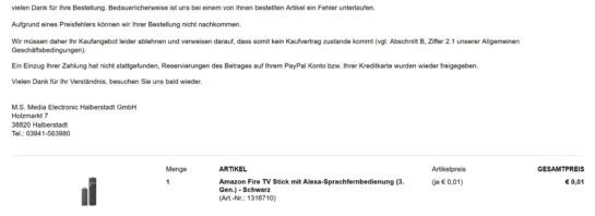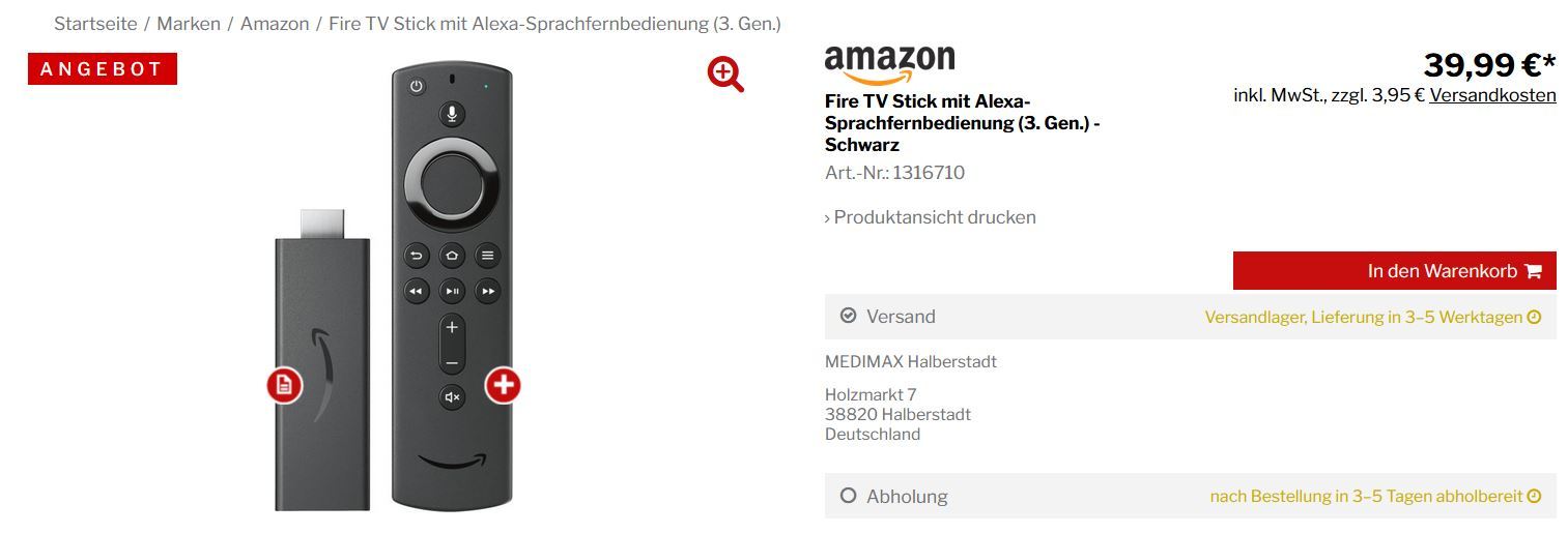 Bei MediMax bekommt man den Amazon Fire TV Stick (mit Alexa-Sprachfernbedienung) für 0,01€ + 3,95€ Versandkosten = 3,96€.