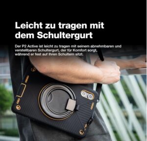 - [Mit Schutzhülle, 360°-Drehständer und Schultergurt]: Das AGM PAD P2 Active Outdoor Tablet verfügt über eine abnehmbare Schutzhülle und einen verstellbaren Schultergurt. Mit Schutzhülle wiegt es 1219g und ist 21,3mm dick; ohne wiegt es 598g und ist nur 9,3mm dick. Ob Sie nach einem schlanken Tablet suchen oder zusätzlichen Schutz benötigen, es passt sich nahtlos Ihren Bedürfnissen an. Die Schutzhülle ist mit einem 360°-Drehständer ausgestattet, der den Transport erleichtert und als Ständer fungiert, damit das Tablet auf jeder Oberfläche aufrecht stehen kann. Der verstellbare Schultergurt sorgt zudem für einen bequemen Sitz, der Ihren Anforderungen entspricht.