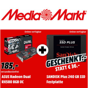 Mirëdita! Es geht weiter mit dem Geschenken bei Media Markt sowie das Bundle ASUS Radeon Dual RX580 8GB OC + SANDISK Plus 240 GB SSD Festplatte für 185€ inklusive Versand und bei Marktabholung verfallen die Versandkosten. Im Preisvergleich laut Idealo müsste man 221€ hinblättern sodass ihr aber 36€ spart und ihr hier zum einem guten Preis zuschlägt.