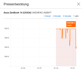 Bei Mediamarkt bekommt man derzeit die ASUS ZenBook 14 (UX434FAC-A5091T) , Notebook mit 14 Zoll Display, Core i5 Prozessor, 8 GB RAM, 512 GB SSD, Intel UHD Graphics 620, Royal Blue für 849,00 statt PVG ab 956,00 Euro inkl.Versand