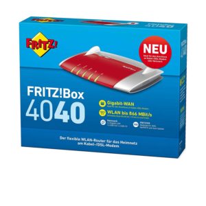 - Lieferumfang: AVM FRITZ!Box 4040 WLAN-Router, Netzteil, Servicekarte (FRITZ! Notiz), Netzwerkkabel (1,8 m, weiß), Kurzanleitung