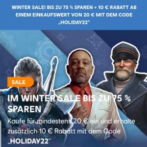 Beim Ubisoft Winter Sale könnt ihr jetzt bis zu 75 % sparen und bekommt auch noch 10 € Rabatt ab einem Einkaufswert von 20€.