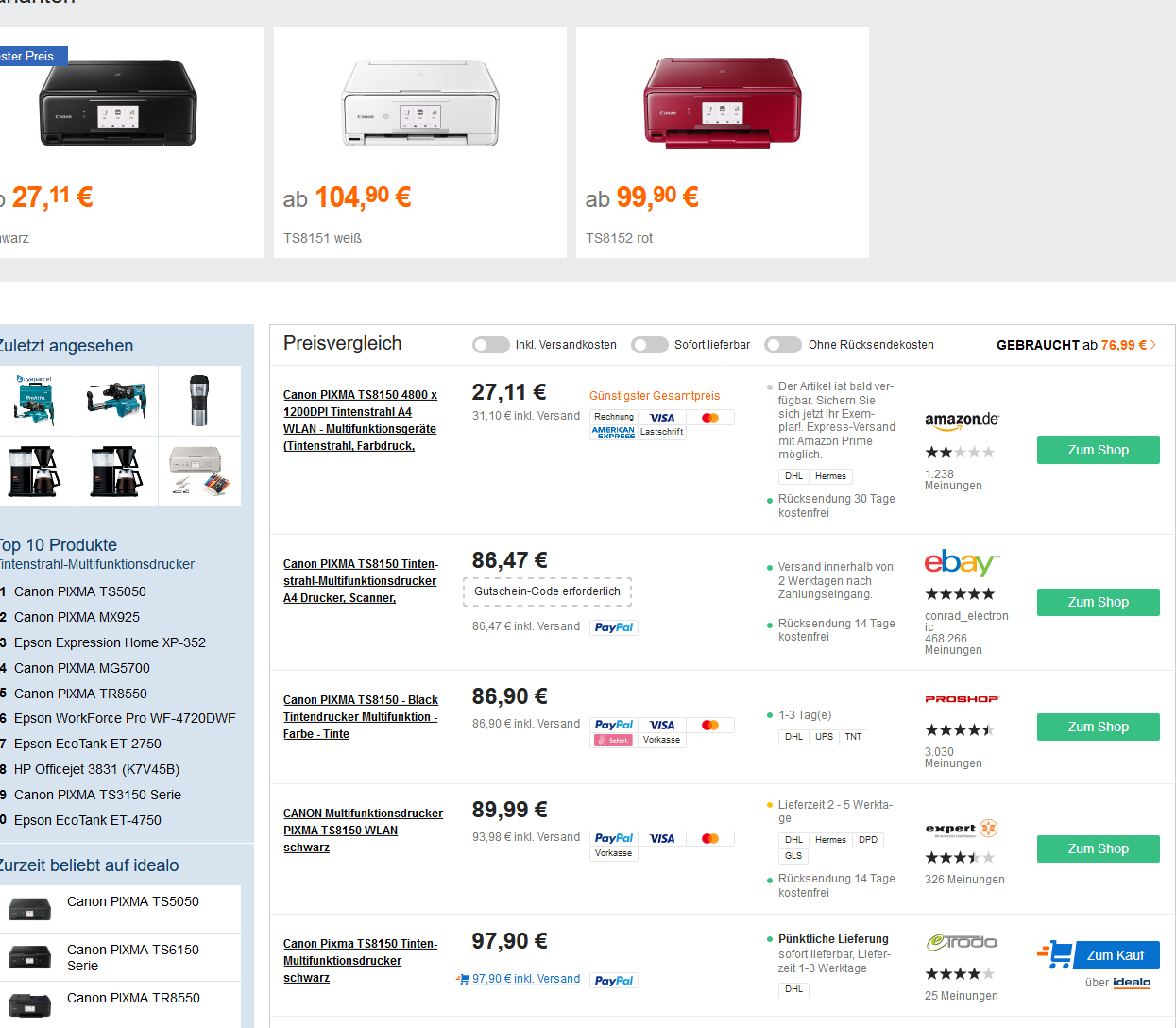 Bei Amazon bekommt man zum Knallerpreis! sobald der Artikel verfügbar ist den Canon PIXMA TS8150 4800 x 1200DPI Tintenstrahl ist zwar derzeit nicht im Lager versuch ist es wert für 27,11 statt PVG ab 86,47 Euro.Versand für Prime Kostenlos.