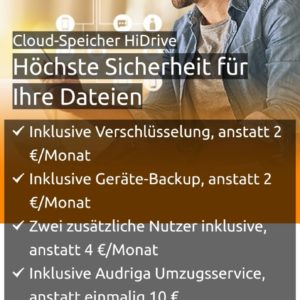 COMPUTERBILD AKTION: Strato HiDrive mit 1 TB! Sicherer Cloud Speicher mit Ende zu Ende Verschlüsselung auf deutschen Servern. 1 Jahr für einmalig 1 Euro Einrichtungsgebühr. Inkl. alternativem App-Zugriff und verschiedenen Zusatzoptionen. Nach Ablauf des Jahres beträgt der Monatspreis 6€ (gegenüber 7,50€ Normalpreis) sofern nicht 30 Tage vor Ablauf des Jahres gekündigt wurde.