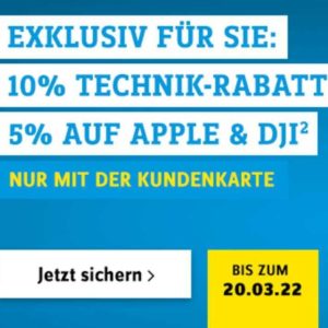 5% Rabatt auf Produkte der Marken Apple und DJI bzw. 10% Rabatt auf das Conrad Sortiment. Von Rabatten ausgenommen sind Artikel der Marken Amazon, Sonos, Prepaid-/ Geschenkkarten, Bücher, DVDs/Blu-rays, sowie Kundenkarte PLUS+. Aktion nur gültig 1x für Privatkunden mit gültiger Kundenkarte von 17.-20.03.2022. Nicht mit Vorteilscodes aus anderen Aktionen kombinierbar. Beim Filialkauf: Vorteilscode mit Ihrer Kundenkarte an der Kasse vorlegen. Bei Online-Bestellung: nur für registrierte Privatpersonen mit einer gültigen Kundenkarte oder ab Neubeantragung. Abgabe nur in haushaltsüblichen Mengen.
