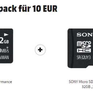 Bei MediaMarkt bekommt ihr gerade im Doppelpack die SONY microSDHC Performance Speicherkarte (32 GB, 100 MB/s, Class 10, UHS Class 1) für nur 10 Euro inkl. Versand.