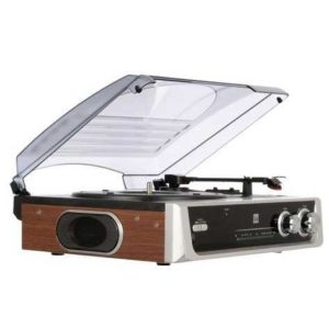 Plattenspieler mit Riemenantrieb: Drehzahl in U/min: 33/45Mechanische LautstärkeregelungIntegriertes UKW Radio mit WurfantenneLine-Out Audio Ausgang