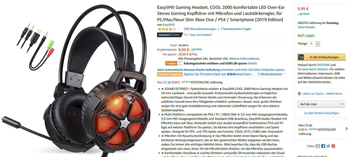 Bei Amazon bekommt man 5€ Gutschein aktivieren das EasySMX Gaming Headset, COOL 2000 komfortable LED Over-Ear Stereo Gaming Kopfhörer mit Mikrofon und Lautstärkeregler, für PC/Mac/Neue Slim Xbox One / PS4 / Smartphone [2019 Edition] für 4,99 € inkl.Versand prime (PVG ab 19,89)