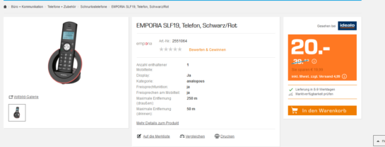 Bei Saturn bekommt man derzeit das EMPORIA SLF19AB, Telefon, Schwarz für 25,00 Euro bei Abholung Filiale (PVG ab 43,00 Euro) Versand Kostet 4,99 Euro!