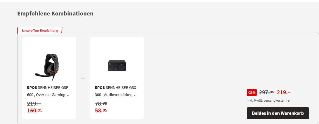 Auf MediaMarkt bekommt man die EPOS SENNHEISER GSP 600 Over-ear Gaming Headset + EPOS Sennheiser GSX 300 Gaming Dac externe USB-Soundkarte für zusammen 209€ mit (Newsletter -10€) inkl.Versand