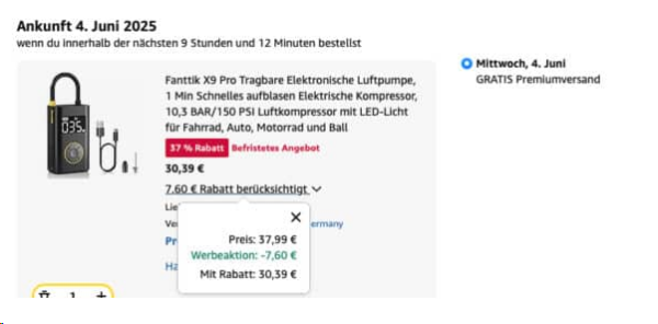 Durch die Kombination der zwei Rabatte (Angebot + Gutschein) gibt es diese Elektronische Luftpumpe für nur 30,39€ statt 59,99€ oder den schon günstigen 37,99€ im Angebotspreis!