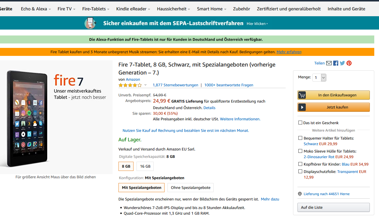 Tip!! bei Amazon bekommt man derzeit die Fire 7-Tablet, 8 GB, Schwarz, mit Spezialangeboten (vorherige Generation – 7.) für 24,99 statt 54,99 (PVG ab 59,98) Euro inkl.Versand mit Prime.