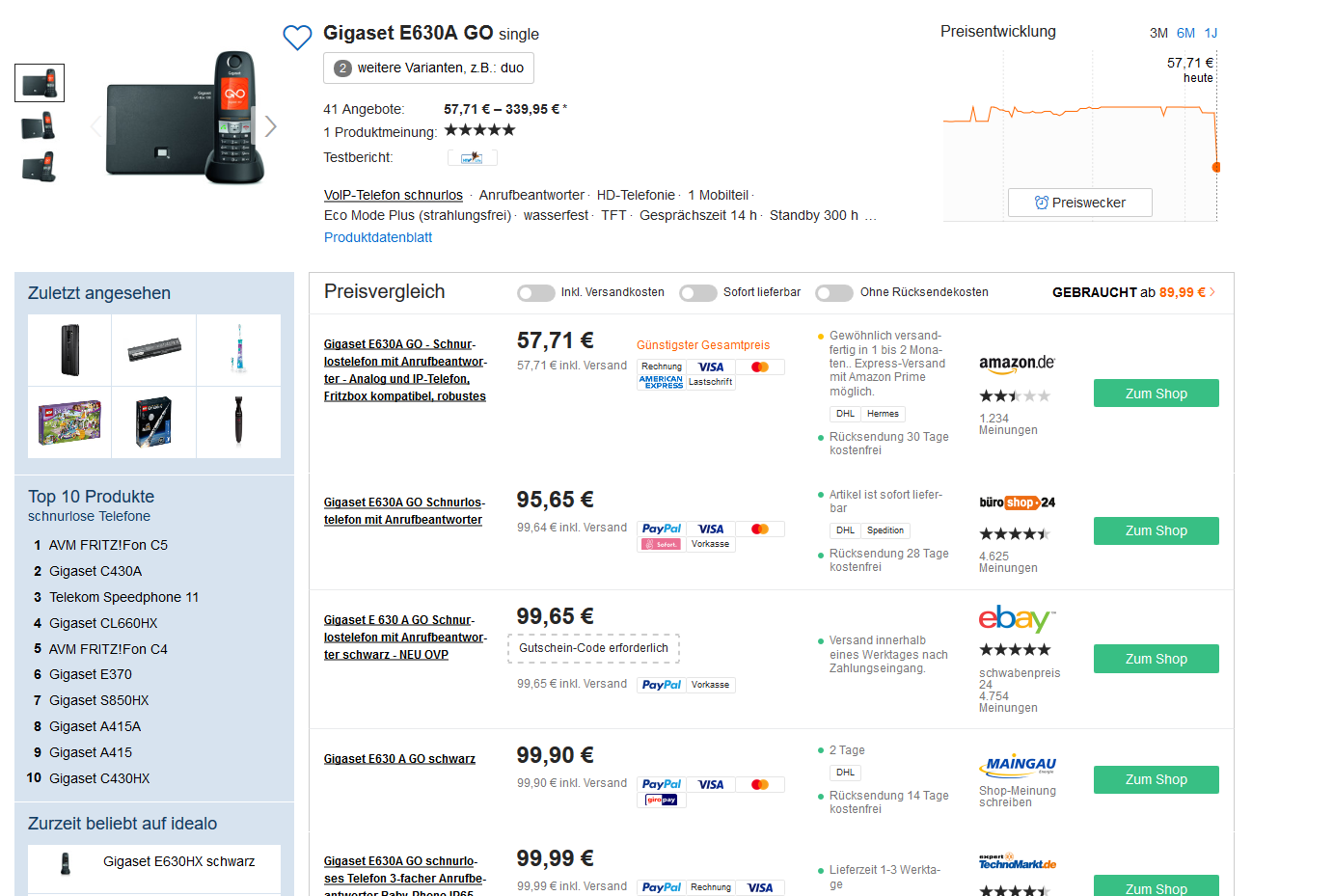 Ob es ein Preisfehler ist? bei Amazon bekommt ihr den Gigaset E630A GO – Schnurlostelefon mit Anrufbeantworter – Analog und IP-Telefon, Fritzbox kompatibel, robustes Mobilteil mit wasserfester Tastatur – DECT-Telefon für Router, schwarz für 57,71 statt PVG ab 99,64 Euro inkl.Versand.
