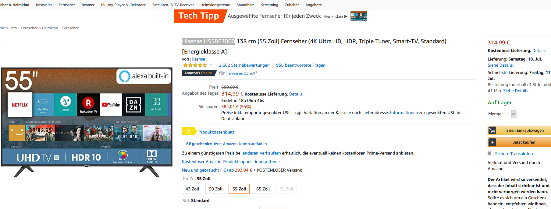 Auf Amazon bekommt man dezeit die Hisense H55BE7000 138 cm (55 Zoll) Fernseher (4K Ultra HD, HDR, Triple Tuner, Smart-TV, Standard) [Energieklasse A] für 349,99 statt PVG ab 420,00 Euro inkl.Versand