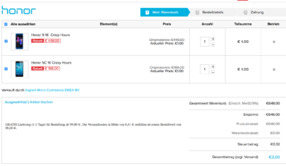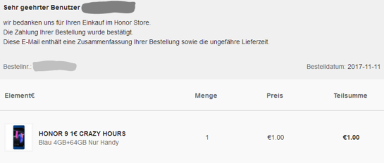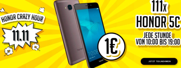 - 111x Honor 9 für nur 1€! Nur am 11.11. zur jeden vollen Stunde von 10 bis 19 Uhr, 11x Honor 9 pro Stunde, in der letzten Stunde 12x Honor 9. Keine Versandkosten. Ohne Vertrag!