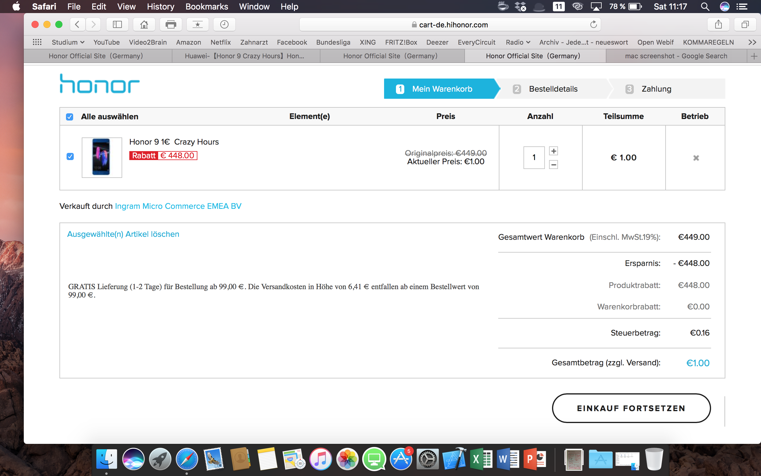 dasSams 11.11.2017, 16:23 #Ausverkauft! Versuch dein Glück nochmal um 17:00. 111x Honor 5C für nur 1€! Nur am 11.11. zur jeden vollen Stunde von 10 bis 19 Uhr, 11x Honor 5C pro Stunde, in der letzten Stunde 12x Honor 5C.