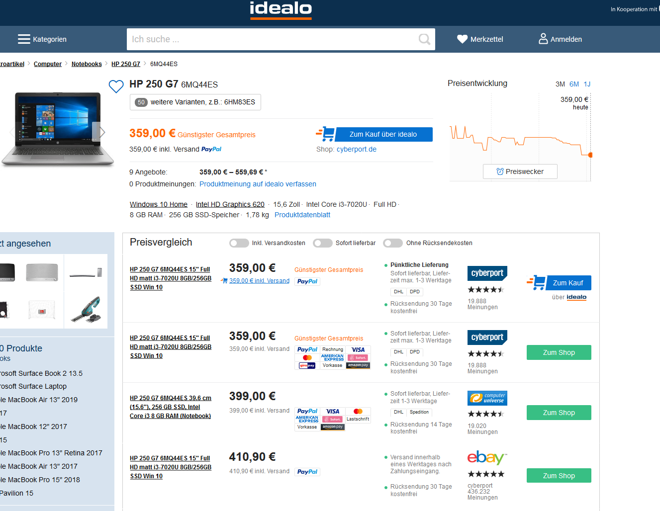 Bei cyberport bekommt man den HP 250 G7 6MQ44ES 15″ Full HD matt i3-7020U 8GB/256GB SSD Win 10 für 359,00 statt PVG ab 399,00 Euro Versandkostenfrei.