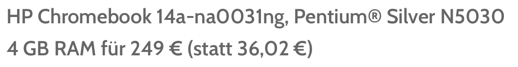 HP Chromebook 14a-na0031ng, Pentium® Silver N5030 4 GB RAM für 249 € (statt 336,02 €)